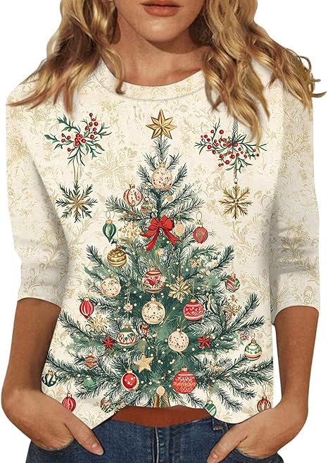 Womens Fashion 2025 Christmas Printed Funny Tshirts Xmas Holiday Tops Trendy Cute 3/4 Length Sleeve Round Neck Blouses